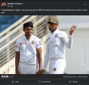 রেকর্ড ভাঙার পর তাইজুলকে অভিনন্দন জানাতে দেরি করেননি সাকিব। নিজের ভেরিফায়েড ফেসবুক পেজে তাইজুলকে সঙ্গে নিয়ে একটি ছবি শেয়ার করে বাংলাদেশ ক্রিকেটের এই মহাতারকা লিখেছেন—