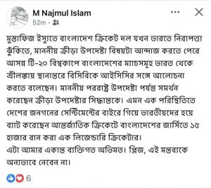 নিজের ফেসবুক আইডিতে দেওয়া সর্বশেষ স্ট্যাটাসে নাজমুল হোসেন লেখেন, মোস্তাফিজ ইস্যুতে বাংলাদেশের ক্রিকেট দল যখন ভারতে নিরাপত্তা ঝুঁকির মুখে, তখন মাননীয় ক্রীড়া উপদেষ্টা আসন্ন টি-টোয়েন্টি বিশ্বকাপে বাংলাদেশের ম্যাচগুলো ভারত থেকে শ্রীলঙ্কায় স্থানান্তরের বিষয়ে বিসিবির সঙ্গে আলোচনা করতে বলেছেন। এই সিদ্ধান্তে পররাষ্ট্র উপদেষ্টারও সমর্থন রয়েছে বলে উল্লেখ করেন তিনি।