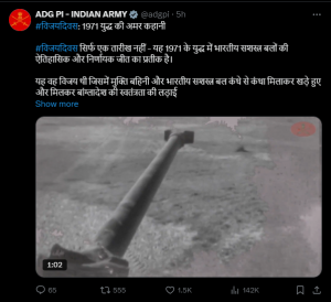 বিজয় দিবস উপলক্ষে মঙ্গলবার (১৬ ডিসেম্বর) সামাজিক মাধ্যম এক্সে একটি বিবৃতি প্রকাশ করেছে ভারতীয় সেনাবাহিনী। সেখানে ১৯৭১ সালের যুদ্ধকে ভারতের দৃষ্টিকোণ থেকে ‘ঐতিহাসিক বিজয়’ হিসেবে উল্লেখ করা হয়েছে।