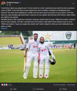 বাংলাদেশ ক্রিকেটের দুই স্তম্ভ সাকিব আল হাসান ও মুশফিকুর রহিমের বন্ধুত্ব এবং মাঠের পারস্পরিক সম্মান দীর্ঘদিনের। সেই সম্পর্কেরই আরেকটি উজ্জ্বল প্রকাশ দেখা গেল মুশফিকের ১০০তম টেস্ট উপলক্ষে সাকিবের আবেগঘন বার্তায়।