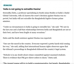 ভারতের জিন্দাল গ্লোবাল ইউনিভার্সিটির দক্ষিণ এশীয় স্টাডিজের বিশেষজ্ঞ অধ্যাপক শ্রীরাধা দত্ত আল জাজিরাকে দেওয়া সাক্ষাৎকারে বলেন, “আদালতের রায় প্রত্যাশিত ছিল; তবে ভারত কোনো অবস্থাতেই শেখ হাসিনাকে প্রত্যর্পণ করবে না।”
